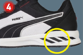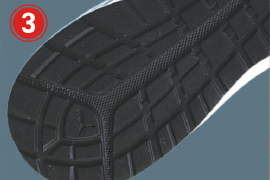 グリップが効くソールパターン。JISの対高熱接触性試験(最高300℃、60秒以内)をクリアし、夏のアスファルトでの変形・亀裂等を防ぐ。油による変形が少ない、耐油ソール。